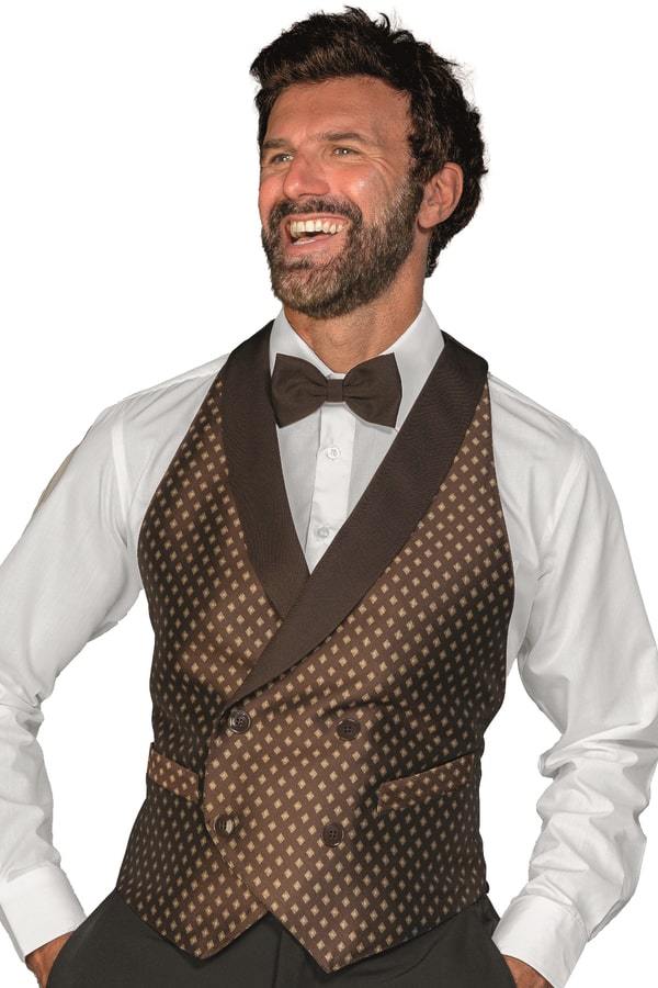 Questo gilet doppiopetto ha il vantaggio di non richiedere taglie avendo una esclusiva vestibilità onesize. Si indossa nella parte anteriore come un grembiule e si regola la taglia mediante una fibia posteriore. Con 4 bottoni fissi e due tasche utilizzabili il Darlington è una scelta pratica e veloce per essere eleganti