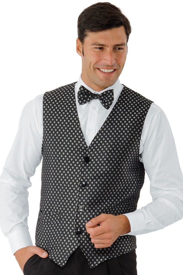 Elegante con ampio collo a V senza risvolto, fettuccia regolabile posteriore, 4 bottoni tondi, classici in asole, tasche estetiche anteriori