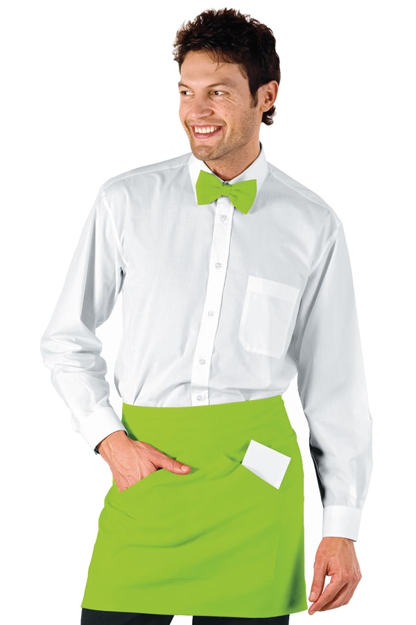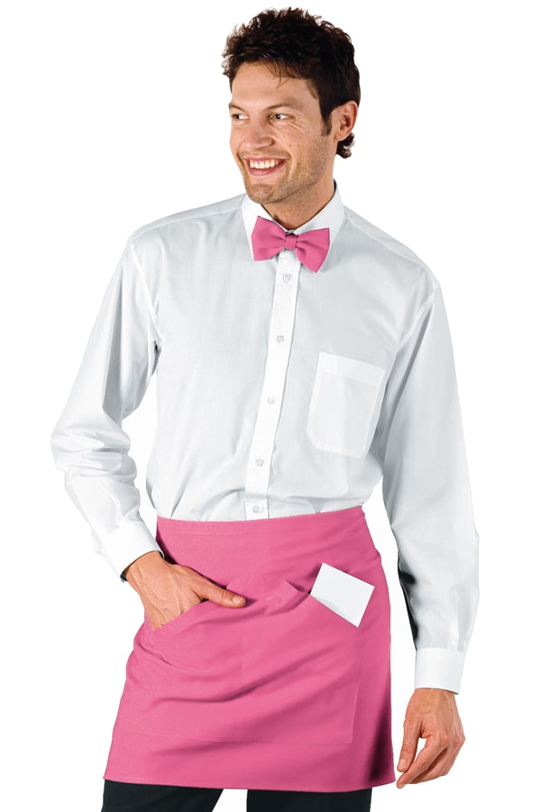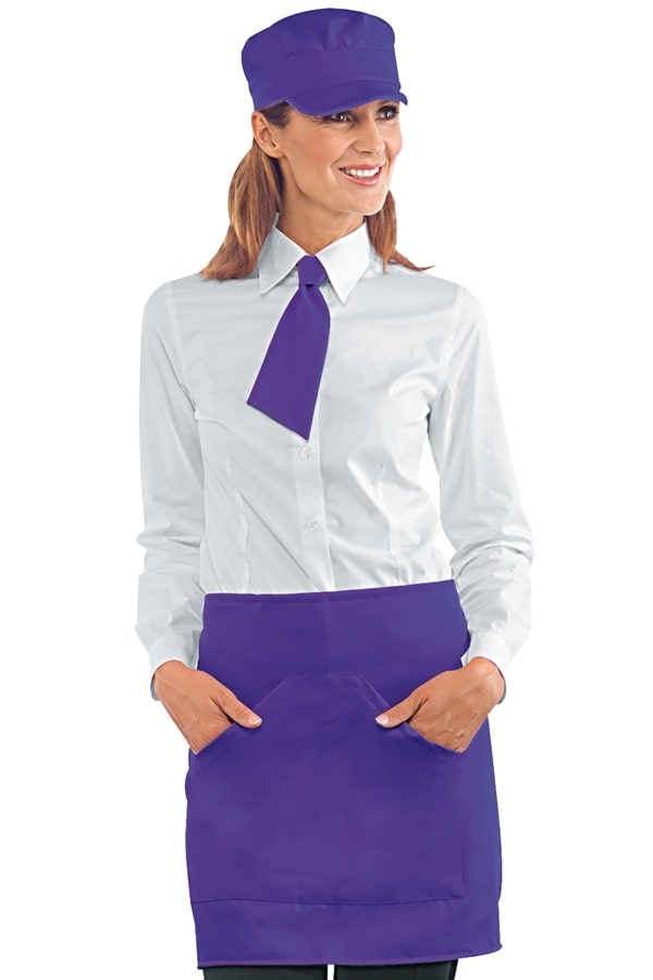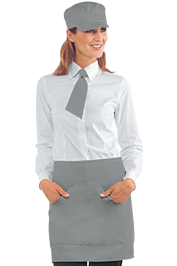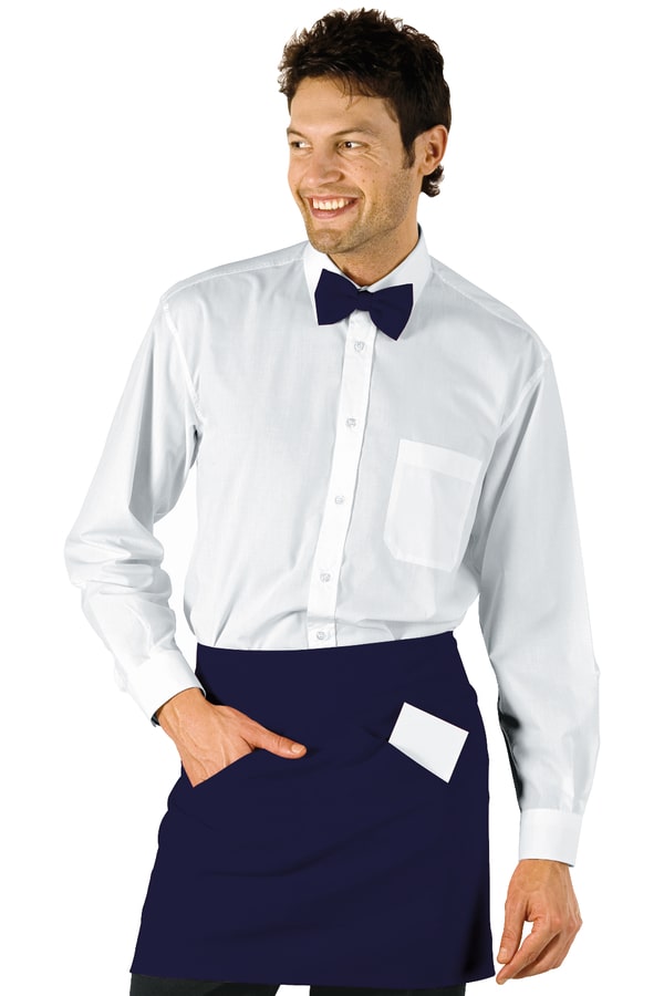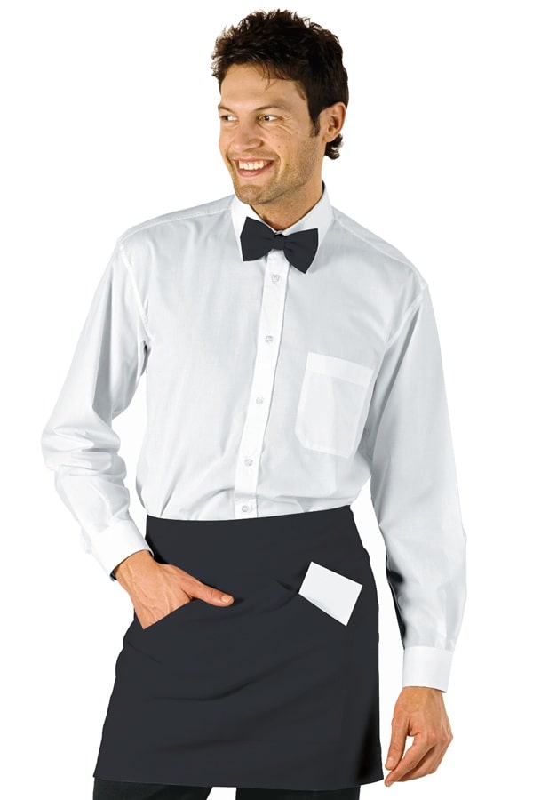 Grembiule con 1 tasca grande centrale a doppio scomparto ed aperture diagonali.  Molto pratica per blocchetti comande, ordini, penne, tablet e cassa. Ha una fettuccia sottile e lunga. Realizzato in polyestere, quindi stirofacile e non assorbente.